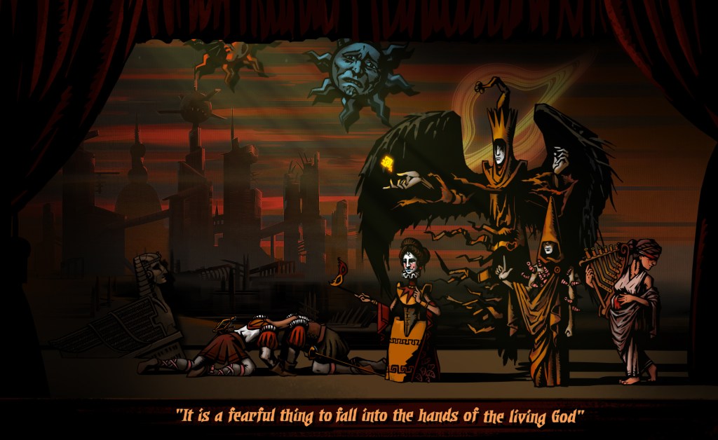 Immediately, we see intertextual references to Bierce’s work. Carcosa, the ancient ruined city, is described in further detail as having impossible cosmic features, with black stars and strange moons. The following stanza anthropomorphises the Hyades, and makes reference to a King in tatters. There is no explicit connection between the King in Yellow and The Stranger in the dialogue, but they are implied to be the same figure.